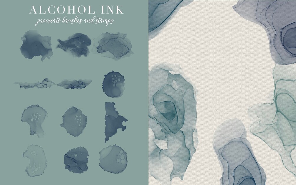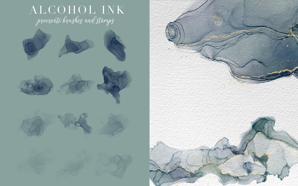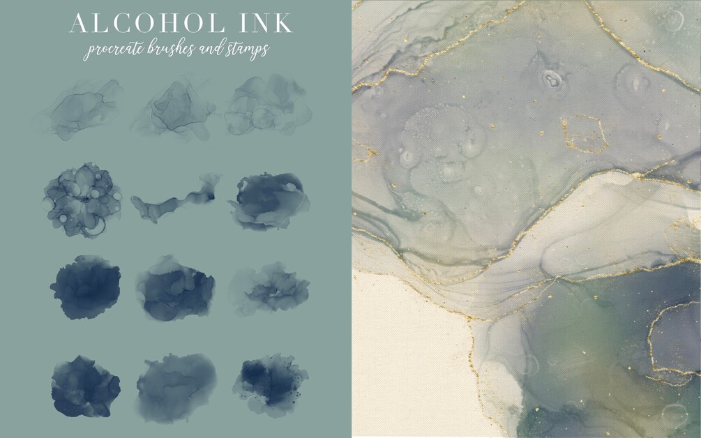 Alcohol Ink Procreate Brushes - Use these Procreate brushes to create beautiful and tranquil alcohol ink art digitally, without the expense and mess! You only need these Procreate Alcohol Ink Brushes to begin creating now! Inside this Alcohol Ink Procreate brush set - you'll find alcohol ink Procreate stamps, Canvas paper textures, gold Procreate brushes to use with gold foil textures, Procreate tutorials and Procreate color palette.