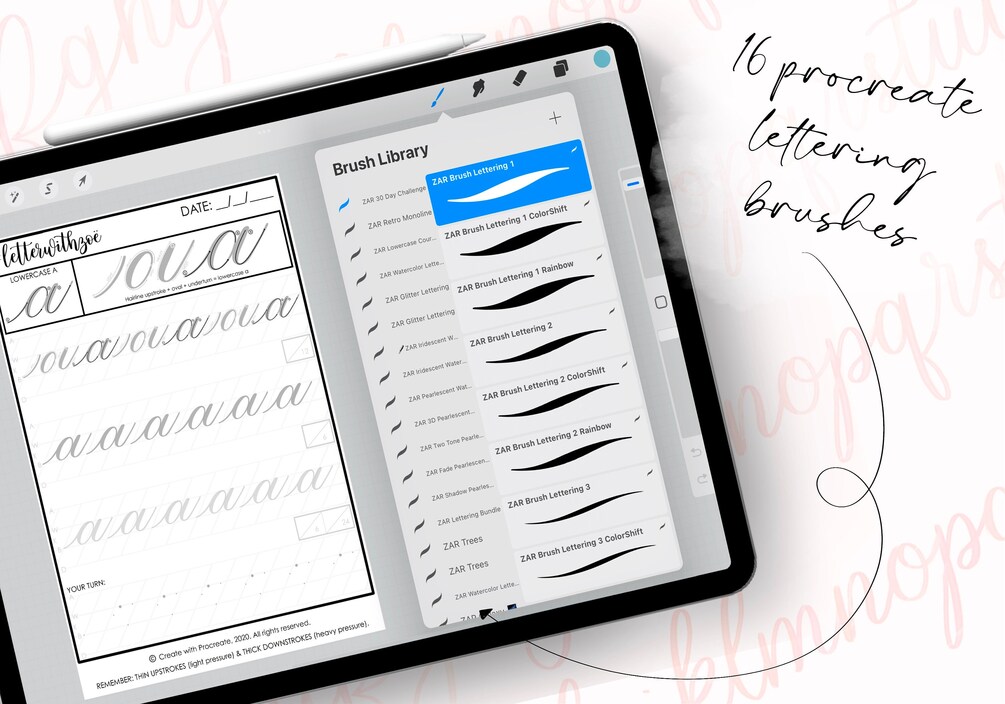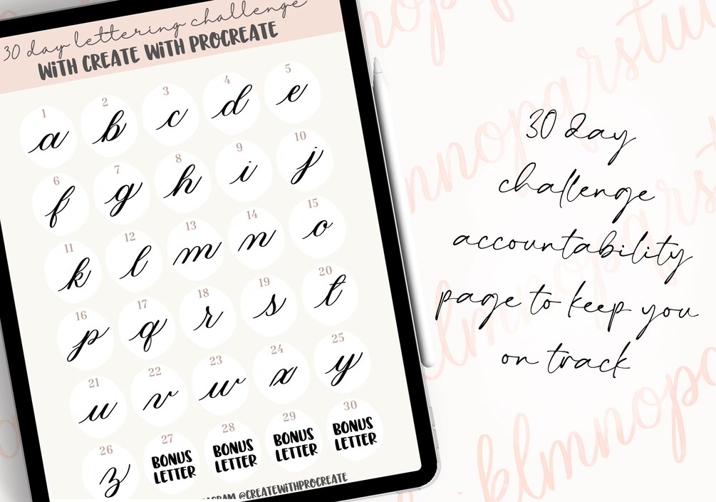 YOU WILL RECEIVE: ✅30 Day Lettering Challenge accountability page ✅39 Lowercase Procreate lettering practice worksheets PDF ✅16 Procreate Lettering Brushes including brush calligraphy, color shift and rainbow