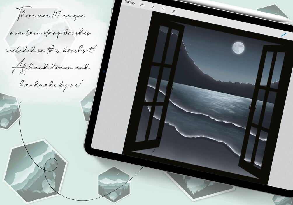 Mountain Procreate Stamp Brushes - Use these Procreate brushes to finish your landscapes and nature artwork with this huge variety of Procreate mountain stamp brushes. Inside the Procreate stamps brushset - You’ll find a watercolor moon stamp, a smudger brush, and a window silhouette brush as bonuses, as well as lots of Procreate mountain brushes.